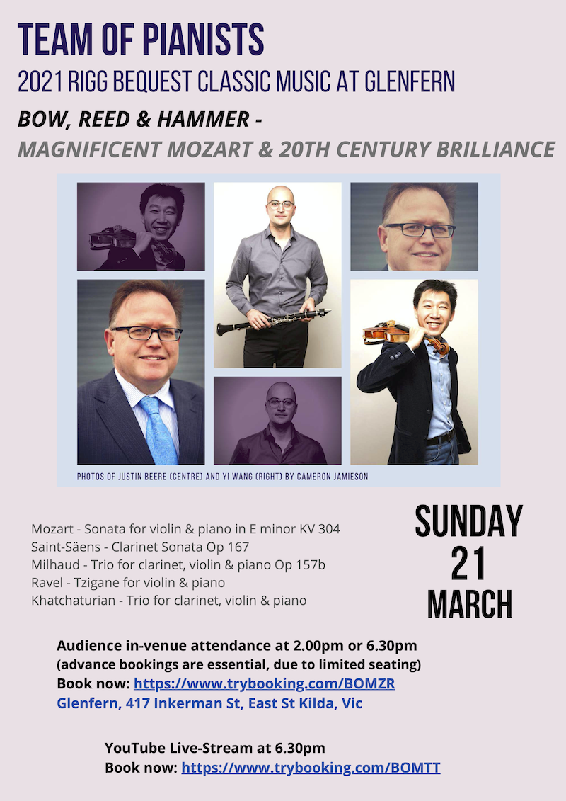 Yi Wang (violin), Justin Beere (clarinet) and Darryl Coote (piano) in a program of duos and trios by Mozart, Saint-Säens, Milhaud, Ravel and Khatchaturian. With one performance at 2.00pm and another at 6.30pm, you can choose to be part of a small socially-distanced in-venue audience at either performance, or enjoy the 6.30pm performance as a live-streamed recital from the comfort of your own home! Download the flyer here.